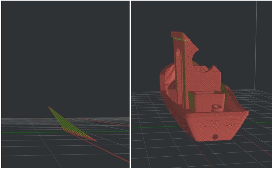 예를 들어 보트를 출력 하면, 기존의 슬라이서는 수직으로 필라를 배출하며 바닥면 부터 출력을 하기에 다음과 같은 형태로 바닥면이 잡히죠