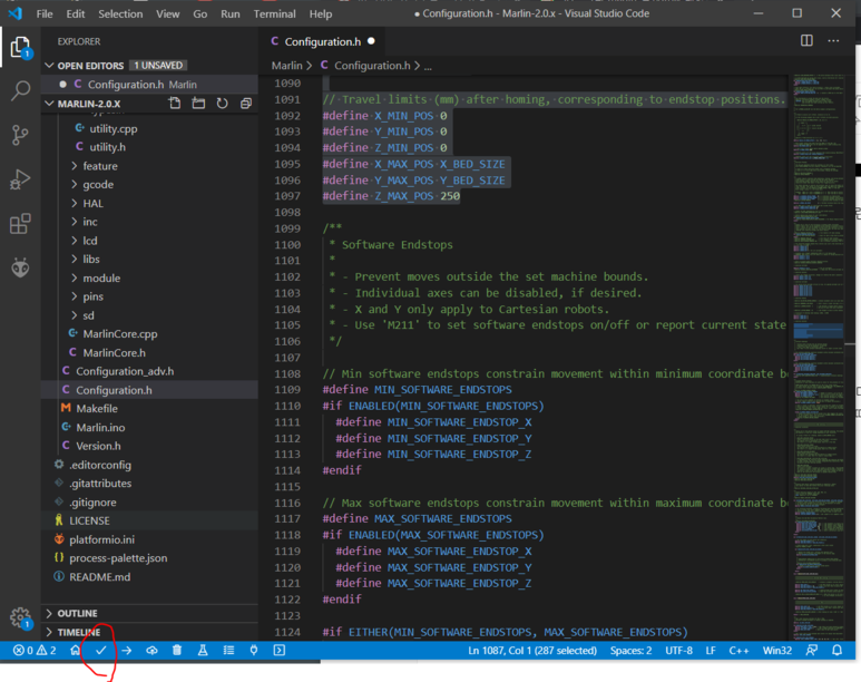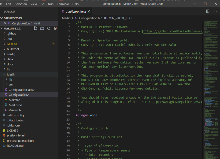 보드와 칩셋을 설정했으면 좌측에 marlin폴더에 configuraion.h를 열어 봅니다.
