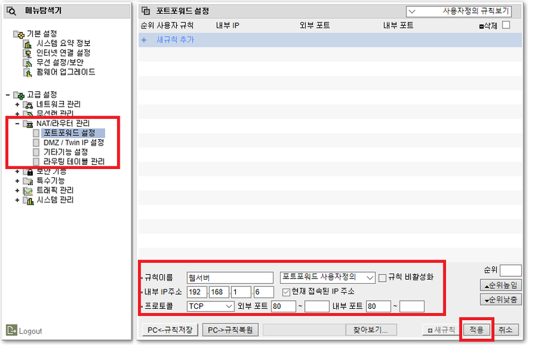 1. 메뉴탐색기에서 고급설정-NAT/라우터관리/포트포워딩 을 클릭한다.