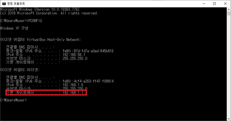 여기서 기본 게이트웨이가 공유기주소로 볼수있습니다. 보통 192.168.0.1