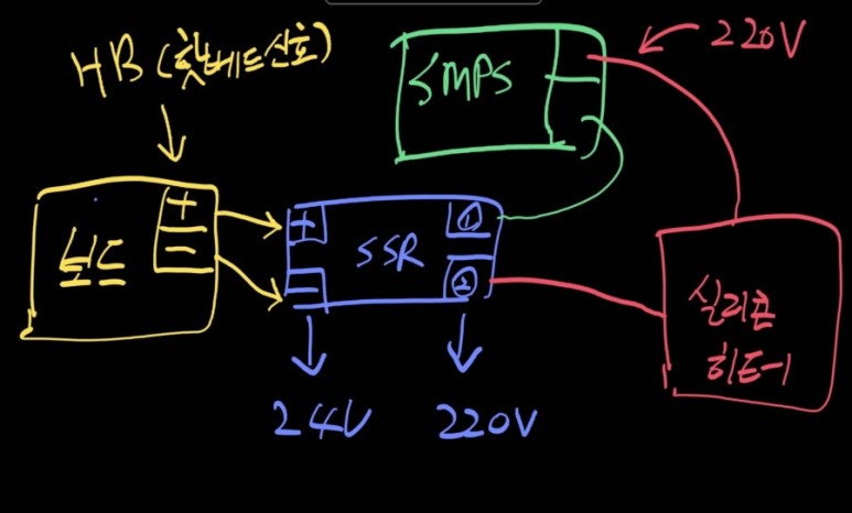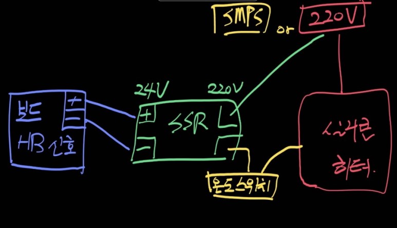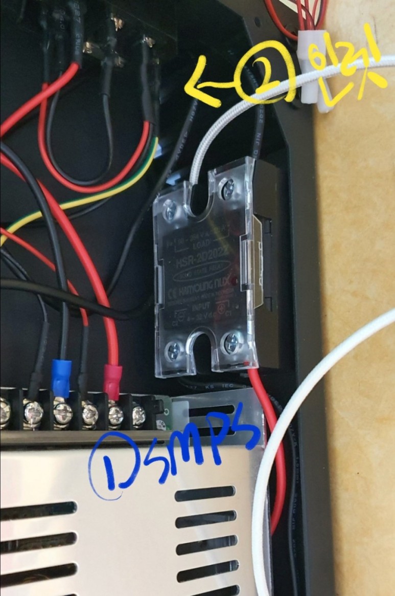 1) 보드에서 히팅베드가 연결되잇던 곳에 SSR의 24V쪽 플러스.마이너스를 연결해주고.